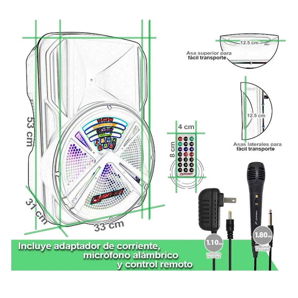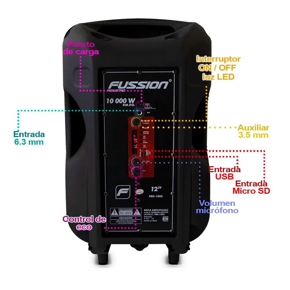 10,000 W P.M.P.O.,Bluetooth, Batería recargable, Radio FM, Entrada USB, Entrada Micro SD (TF), Entrada auxiliar 3.5 mm, Entrada 6.3 mm para micrófono, Control de volumen de micrófono, Control de eco, Tecnología luz LED