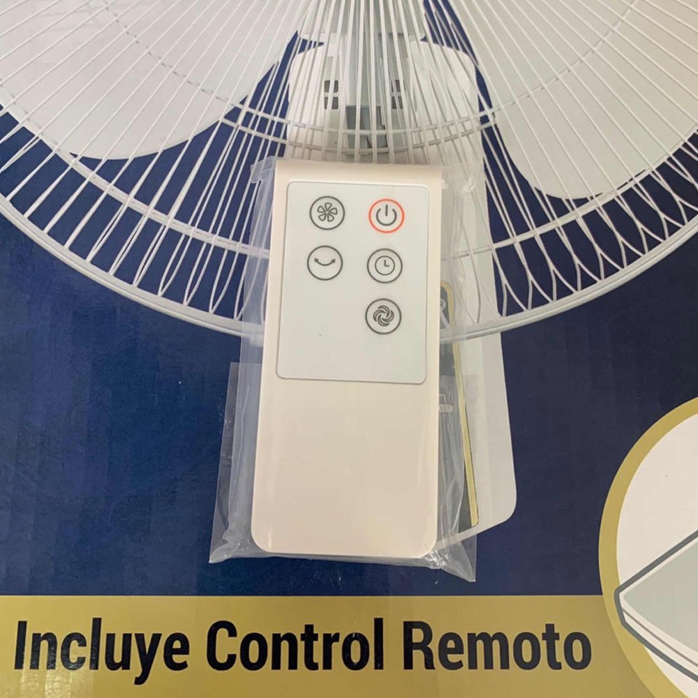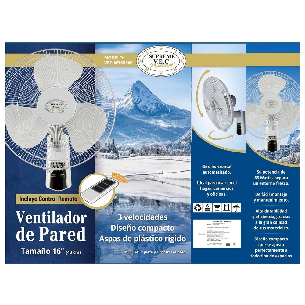 Moderno Ventilador Vec de pared con control remoto, su potencia de 55 watts asegura un entorno fresco, de fácil montaje y mantenimiento con alta durabilidad y eficiencia gracias a la gran calidad de sus materiales. con un gran diseño compacto que se ajusta perfectamente a todo tipo de espacioS. Interruptor de 3 velocidades, Oscila, 110V, Timer de apagado, Control Remoto Inalámbrico, 16 pulgadas