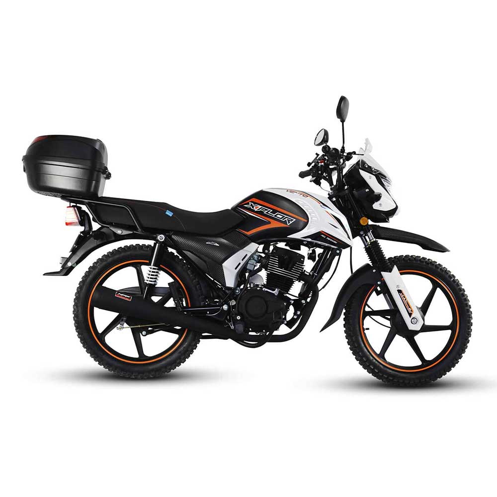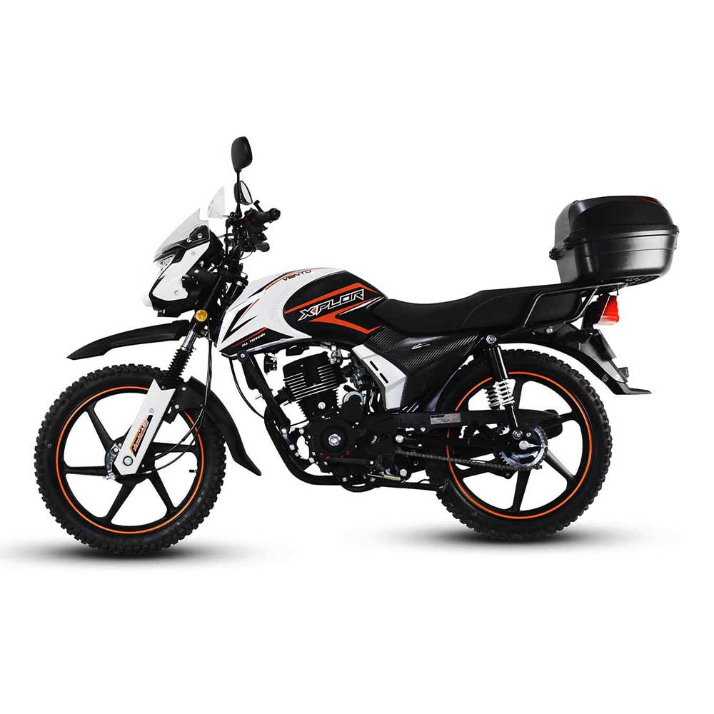Disfruta de las rutas más complicadas con la nueva Vento Xplor 190cc, equipada con llantas Off Road los caminos irregulares no seran dificiles de superar, cuenta con top case que la cual resguarda todos tus accesorios biker además de sus cubre puños que le dan un estilo único.